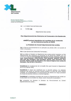 Arrêté d’interdiction de circulation concernant l’ensemble des itinéraires inscrits au Plan Départemental des Itinéraires de Promenade et de Randonnée (PDIPR), comprenant l’ensemble des secteurs, jusqu’au vendredi 13 mars 2026 inclus.