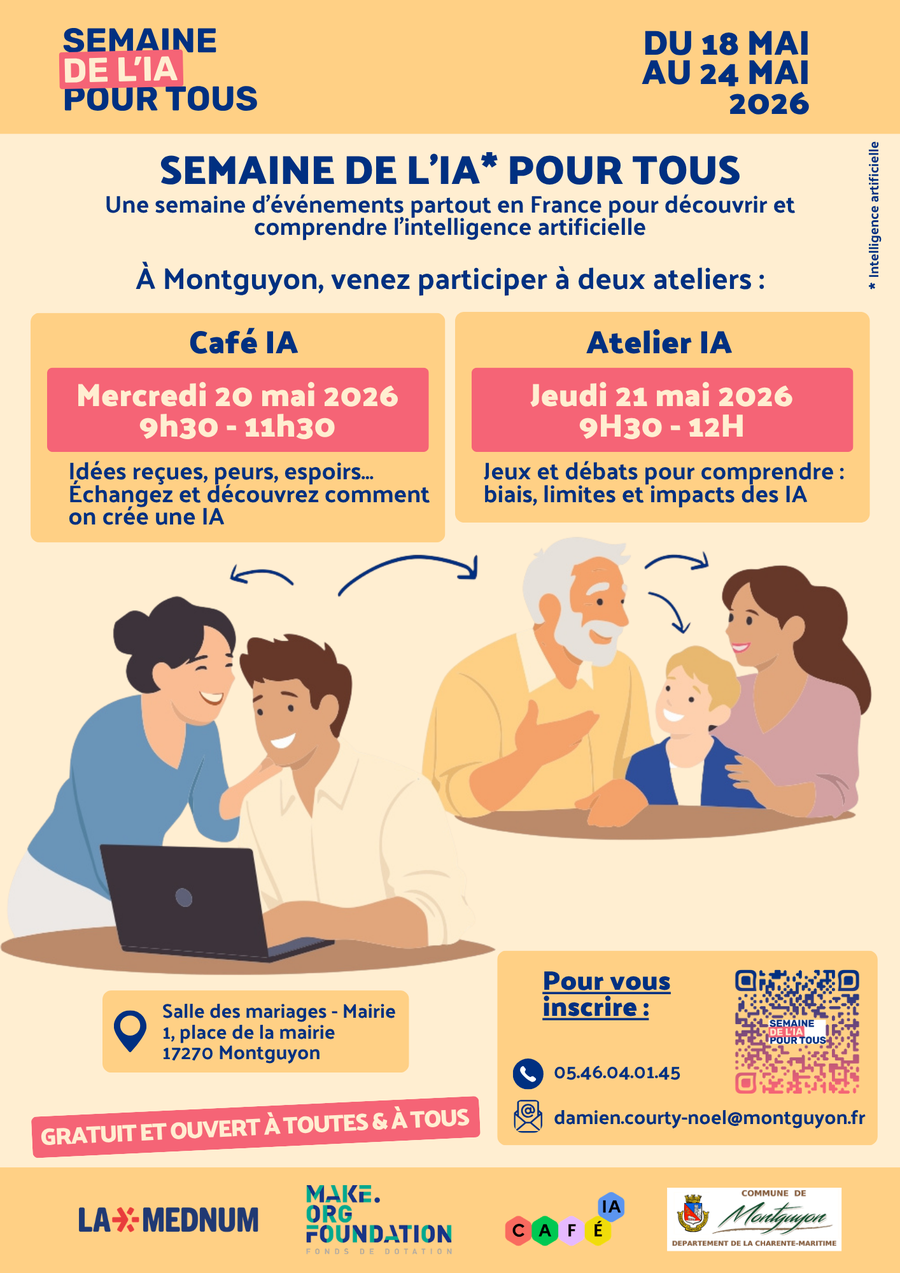 Dans le cadre de la Semaine de l’IA pour tous (18 au 24 mai 2026), la commune vous propose deux rendez-vous pour découvrir l’intelligence artificielle simplement et sans prérequis :