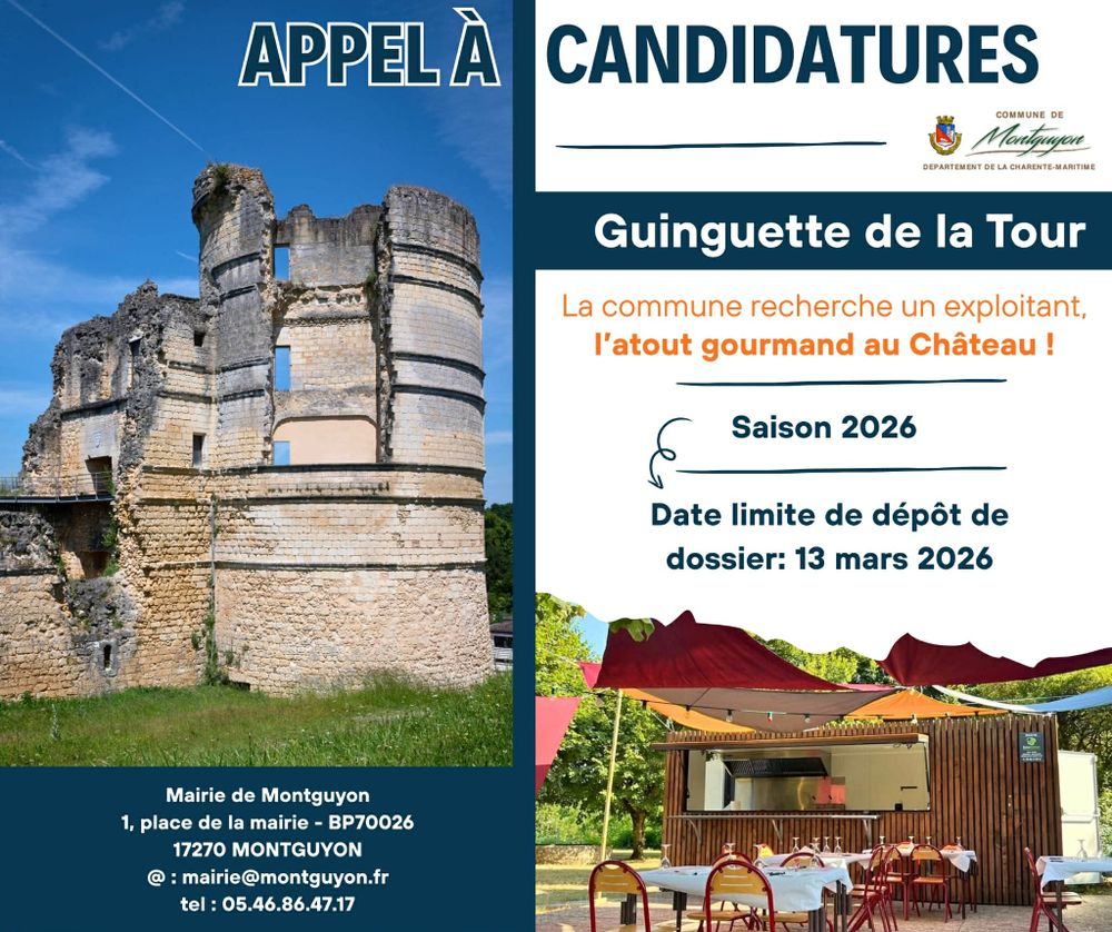 Dossier à retirer et infos pratiques disponibles auprès de la mairie ou sur le site de la commune https://www.montguyon.fr/appel-a-candidature-guinguette.../ ou par mail au mairie@montguyon.fr