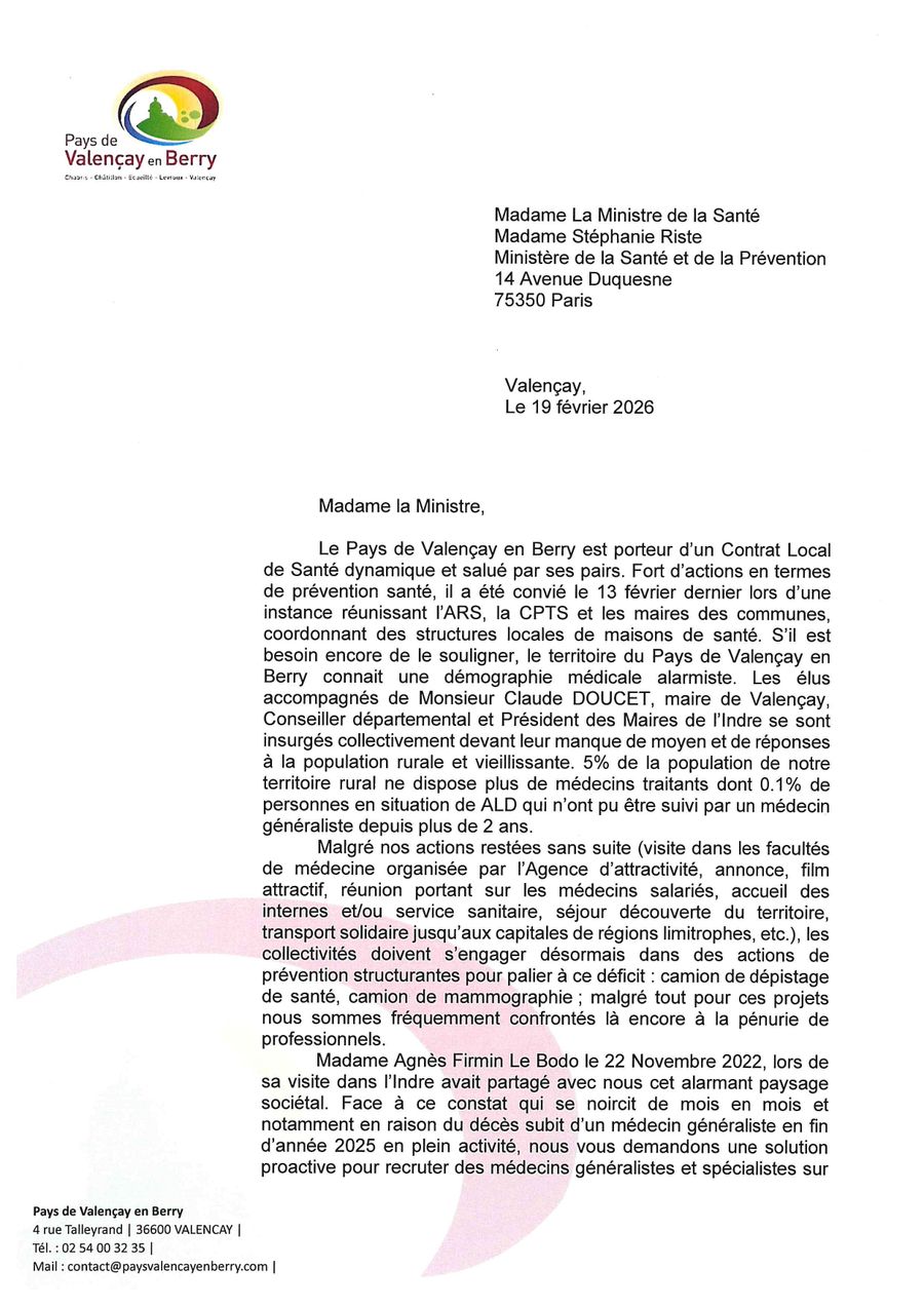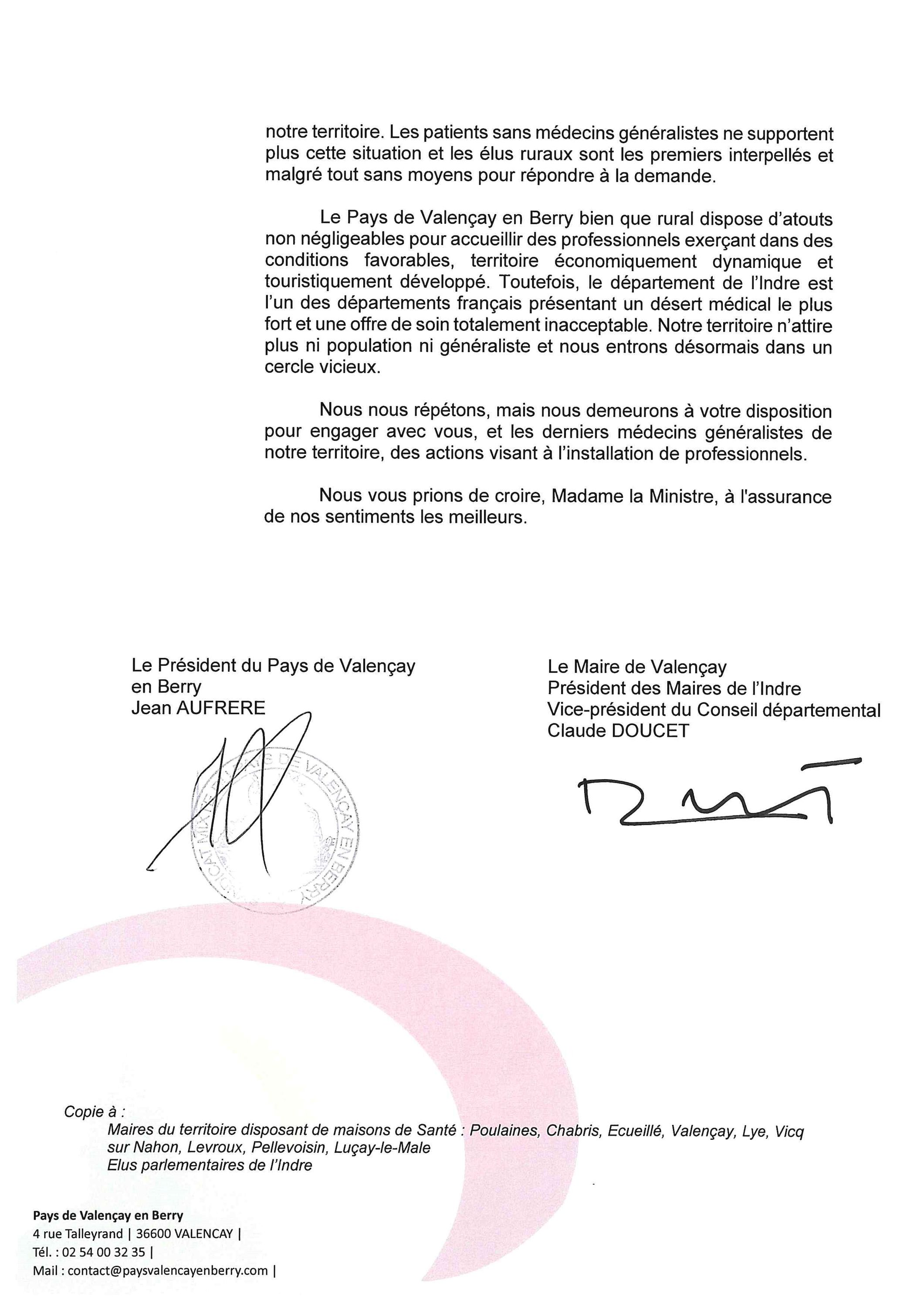 Courrier cosigné par Jean AUFRERE, Président du Pays de Valençay en Berry