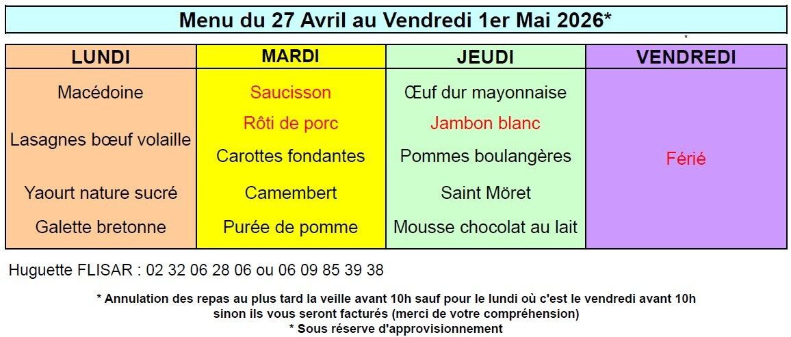 🍽 Menu du 27 avril au 1er mai 2026 🍽