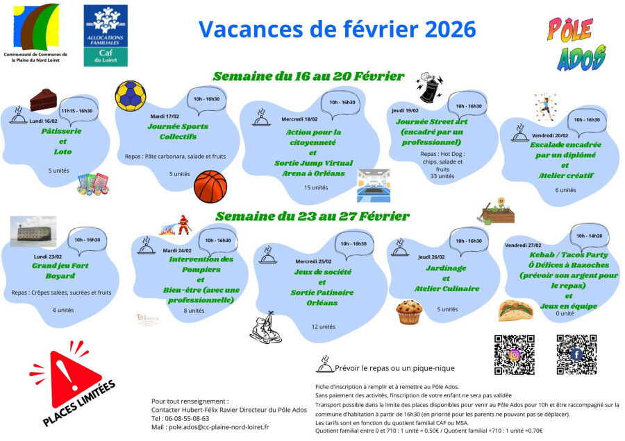 Renseignements par tel au 06-08-55-08-63 ou par mail à pole.ados@cc-plaine-nord-loiret.fr