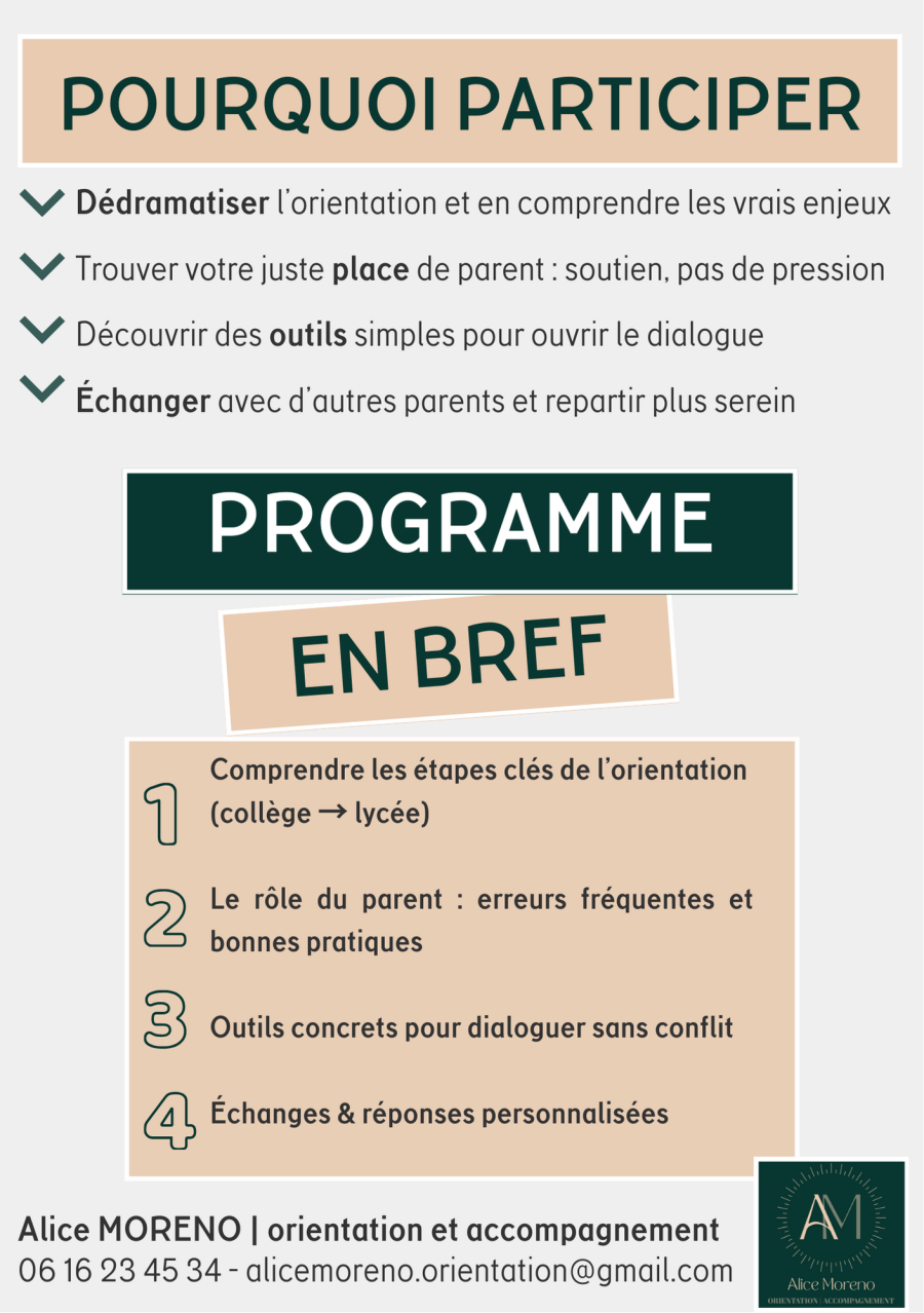 atelier d’orientation scolaire destiné aux parents d’adolescents de la 4ᵉ à la Terminale.