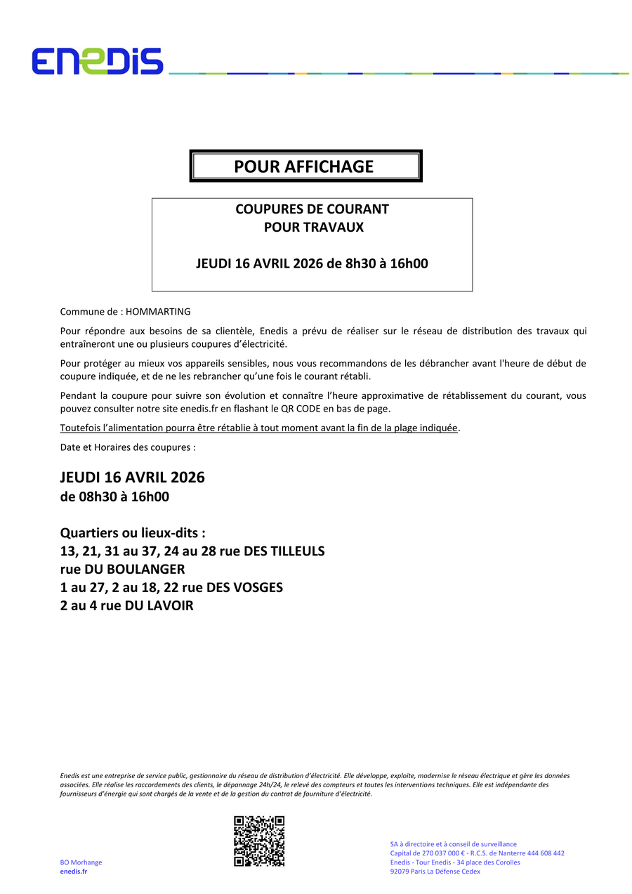 COUPURES DE COURANT : jeudi 16 avril 2026