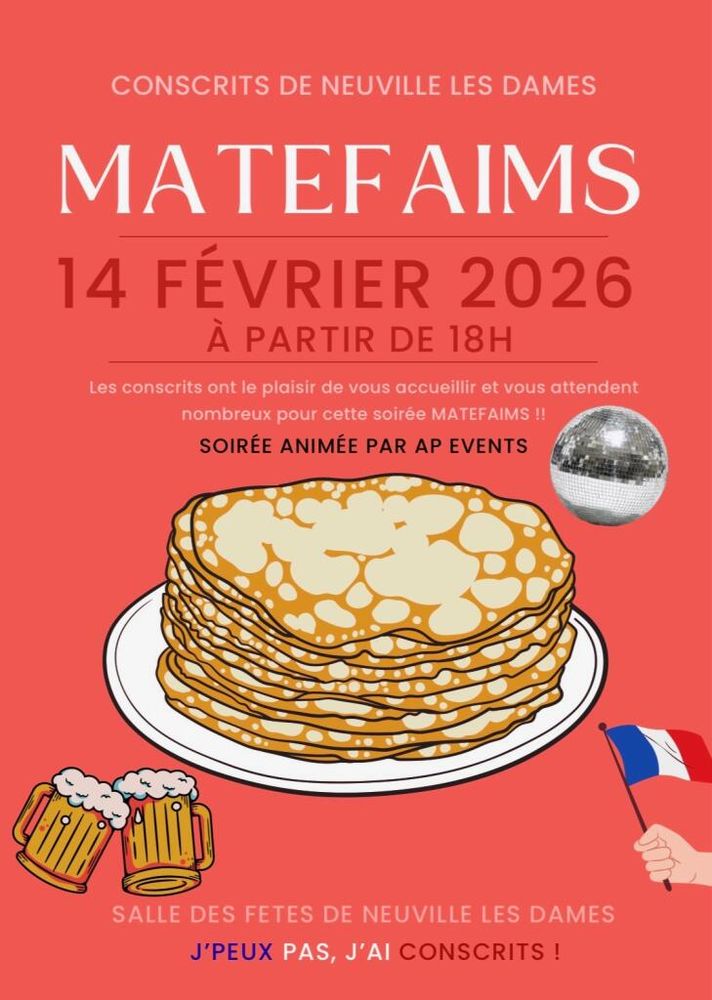 Les Conscrits 🇫🇷 en 6️⃣ de Neuville organisent leur soirée matefaims 🥞🍻 🎶 le samedi 14 février à partir de 18h00 🕕 à la salle des fêtes.