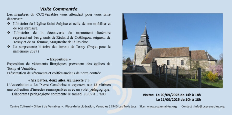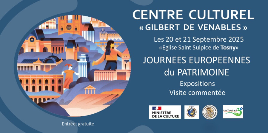 Les membres du Centre Culturel Gilbert de Venables ont le plaisir de vous accueillir à l'église St Sulpice de Tosny , à l'occasion des Journées Européennes du Patrimoine, les 20 et 21 septembre prochains.