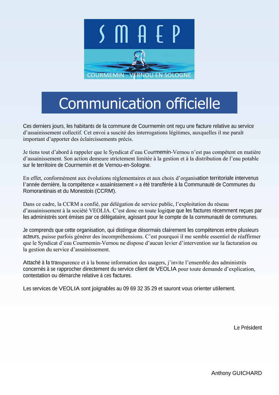 Merci de prendre connaissance du communiqué du syndicat d'eau Coumemin-Vernou en Sologne