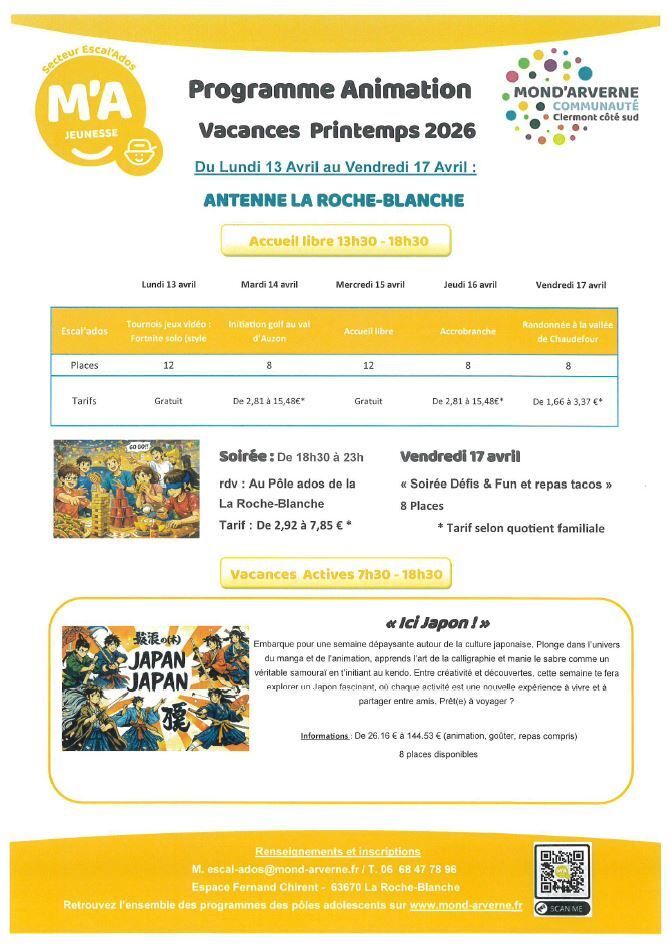 Voici le guide des animations vacances de printemps des pôles ados de Mond'Arverne Communauté.