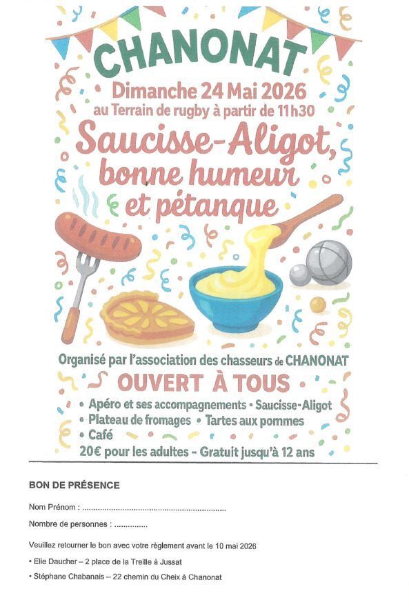 L'Association des Chasseurs de Chanonat organise un apéro festif, avec saucisse et aligot au programme !