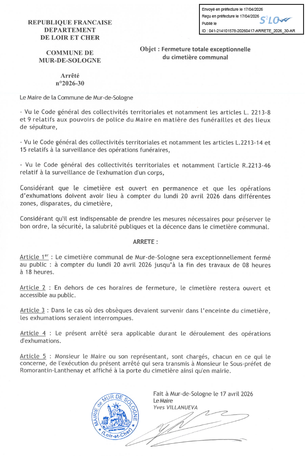 Fermeture du cimetière à compter du lundi 20 avril 2026