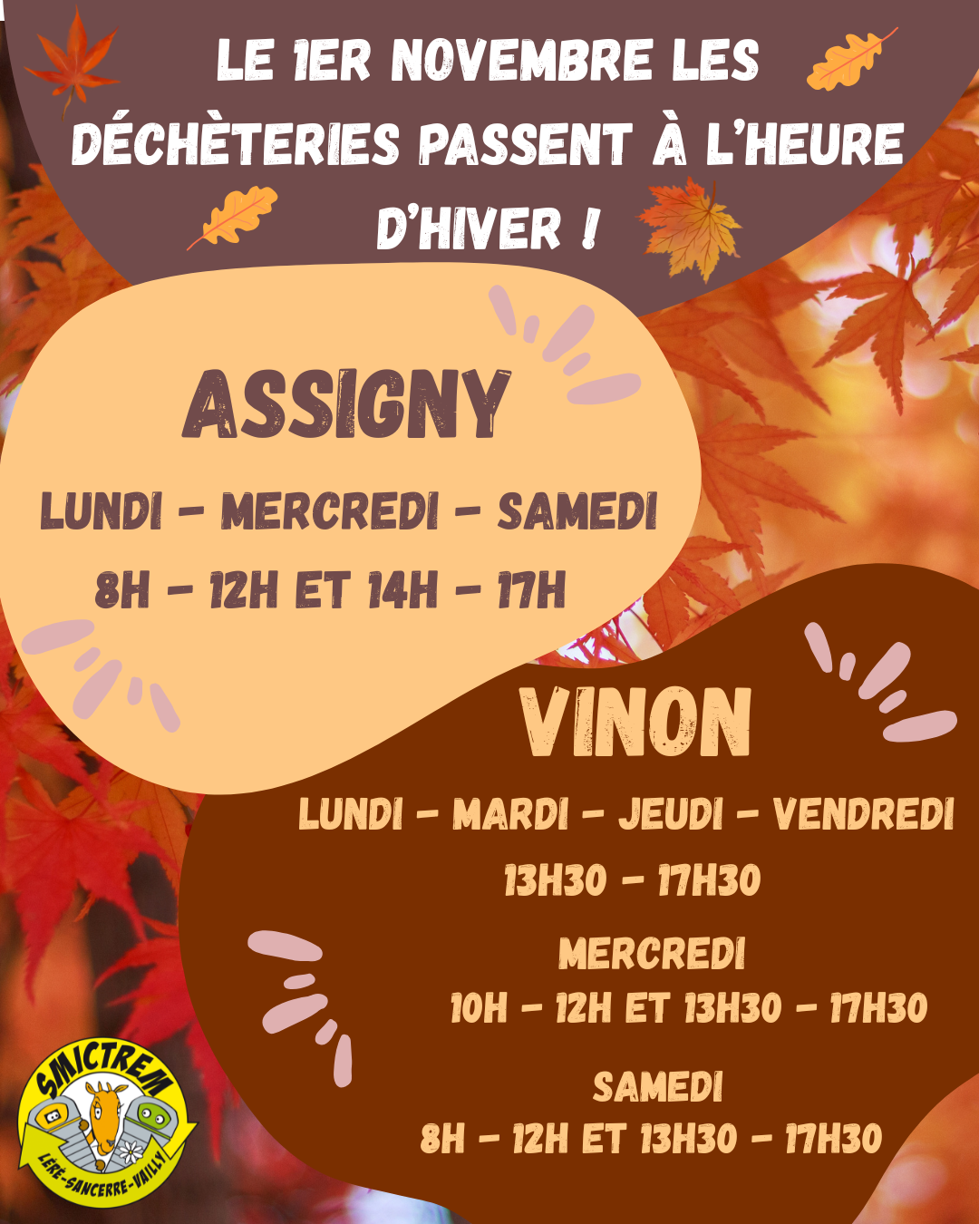 À partir du 1er novembre 2025 et jusqu’en mars 2026 la déchèterie d’Assigny – Vinon adopte ses horaires d’hiver.