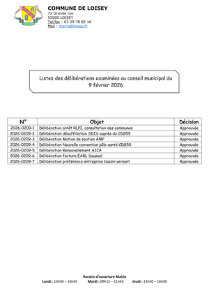 la liste des délibérations examinées