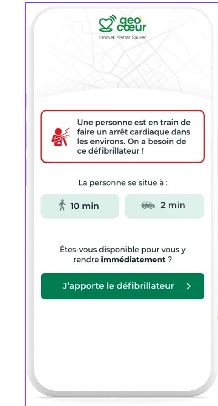 Lorsqu’une personne appelle les secours pour signaler une victime en arrêt cardiaque, les secours envoient leurs effectifs sur place et déclenchent simultanément le ou les Géocœurs les plus proches de l’incident afin d’alerter les personnes à proximité (habitants, passants, promeneurs, salariés, etc.).