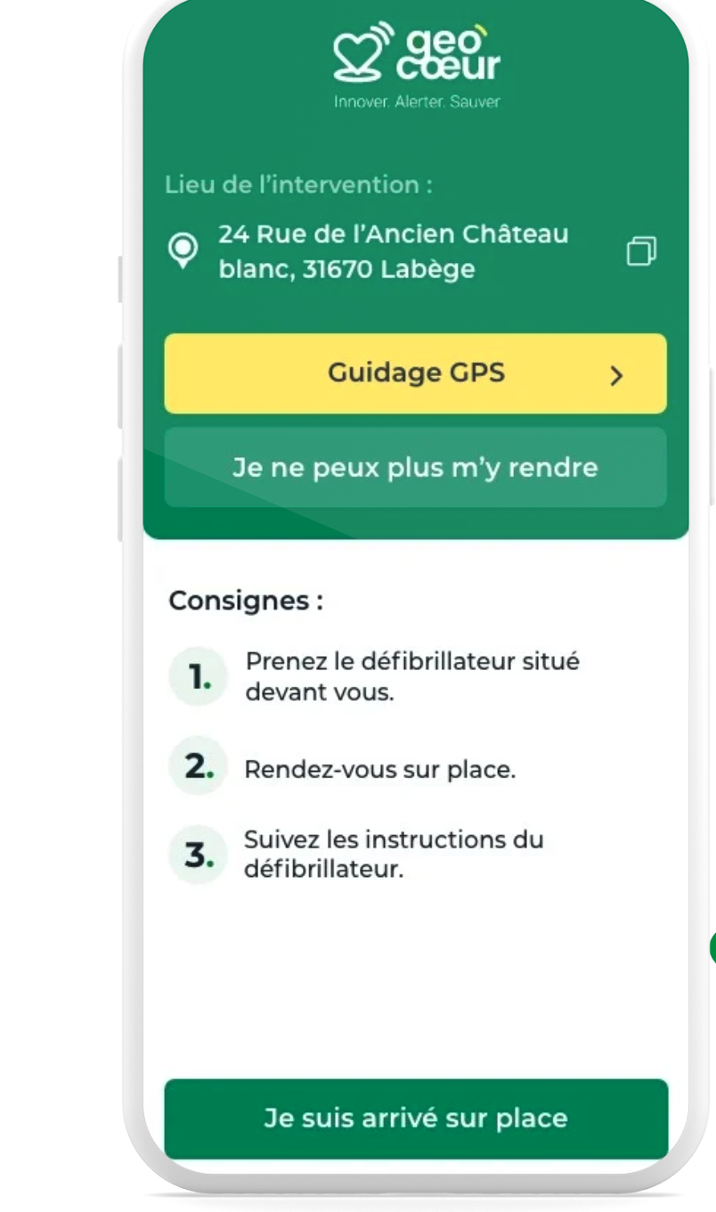 Une fois cette étape validée, la dernière page s’ouvre et affiche l’adresse complète du lieu de l’arrêt cardiaque, ainsi qu’un bouton « Guidage GPS » qui lance automatiquement la navigation vers le lieu de l’intervention.