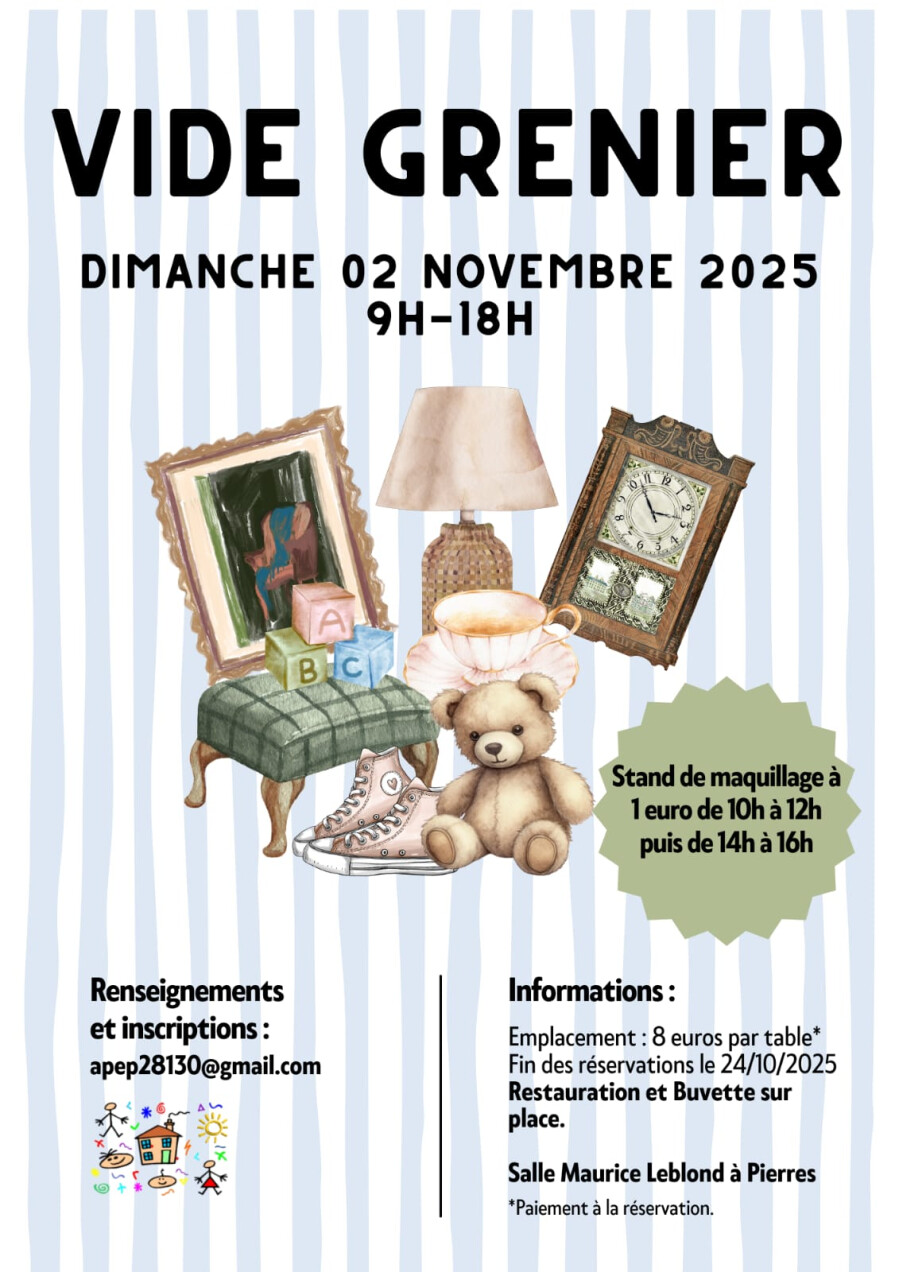L’APEP organise son grand vide-grenier annuel à Pierres. Venez chiner, vendre, acheter ou simplement flâner dans une ambiance conviviale et familiale 🌞
