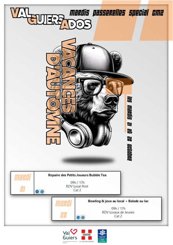 Le programme des vacances d'Automne est sorti pour les ados et les passerelles (CM2) du 20 au 31/10/2025.