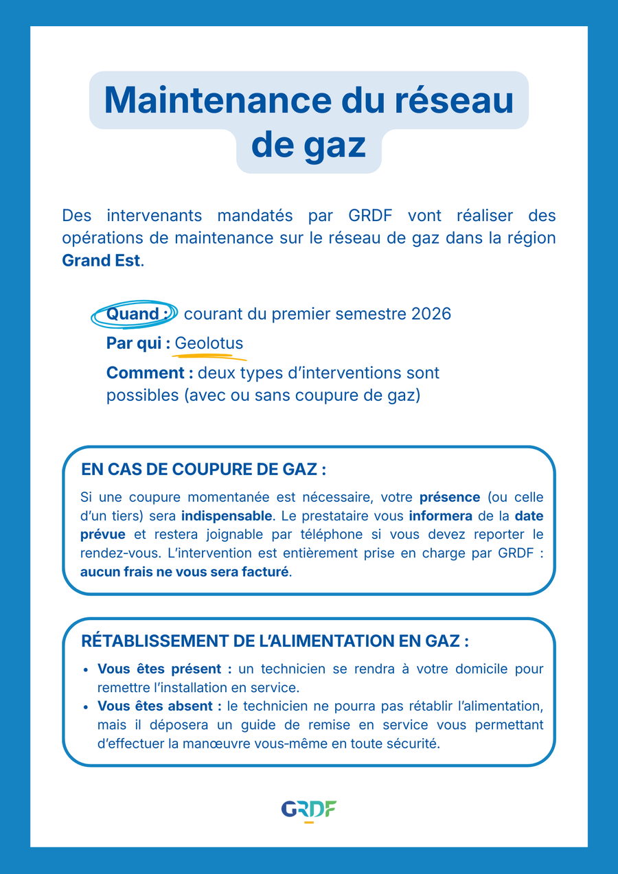 Des interventions de maintenance du réseau de gaz sont programmées par GRDF à Bousbach au cours du premier semestre 2026.