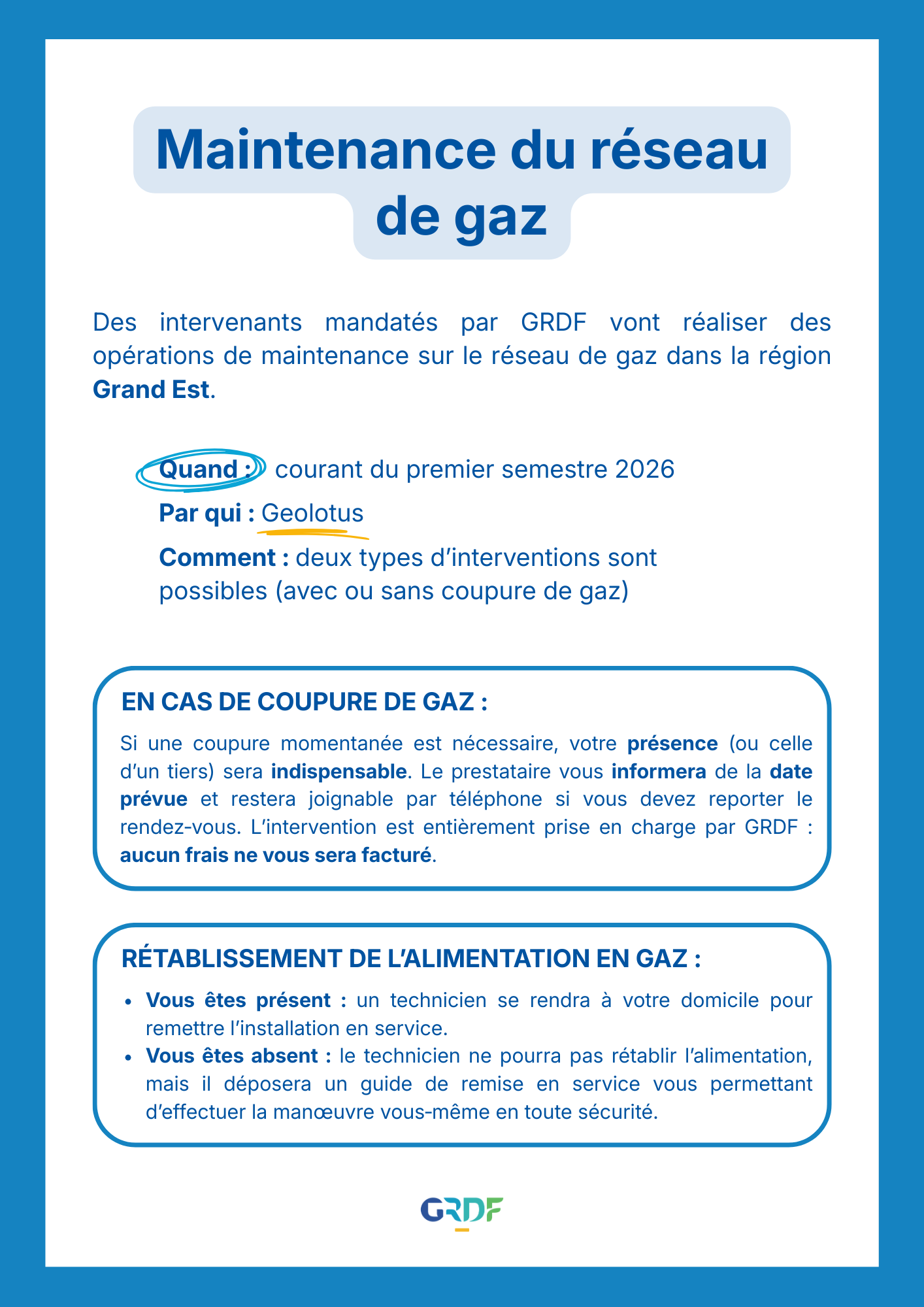 L'intervention est entièrement prise en charge par GRDF : aucun frais ne sera facturé aux habitants.