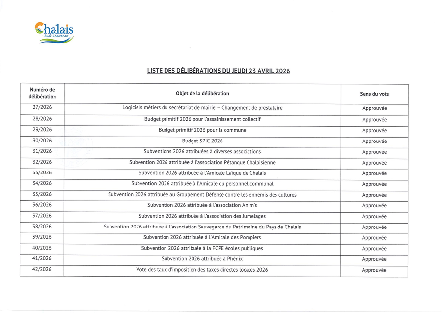 Liste des délibérations CM du 23 avril 2026