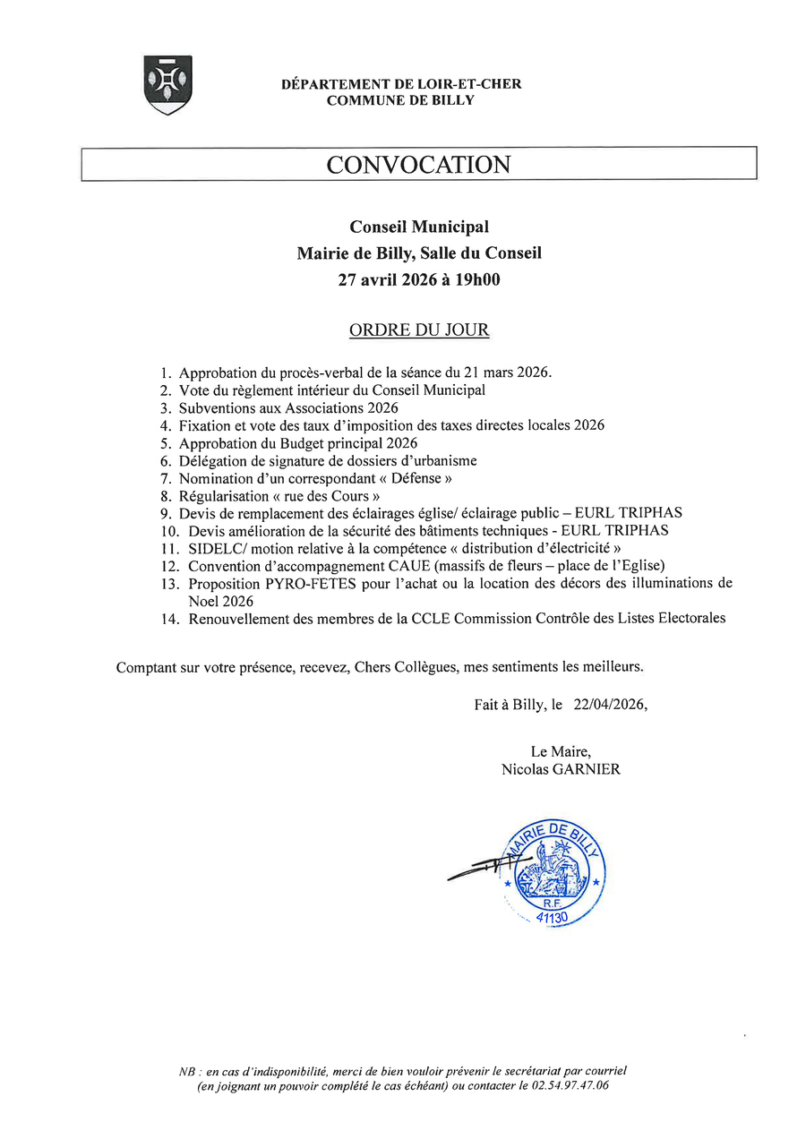Le Conseil Municipal de Billy se réunira dans la salle du conseil le :