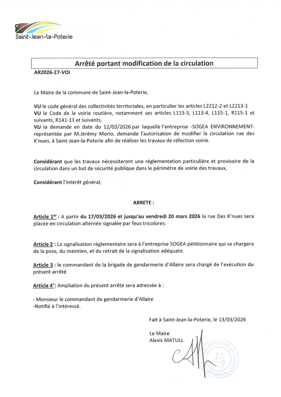 En raison de travaux de reprise de la chaussée, la rue des k'nues sera placée en circulation alternée par feux tricolores,