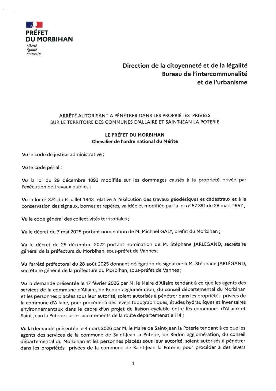 et dans le cadre d'un projet de liaison cyclable entre les communes d'Allaire et de Saint-Jean-la-Poterie,