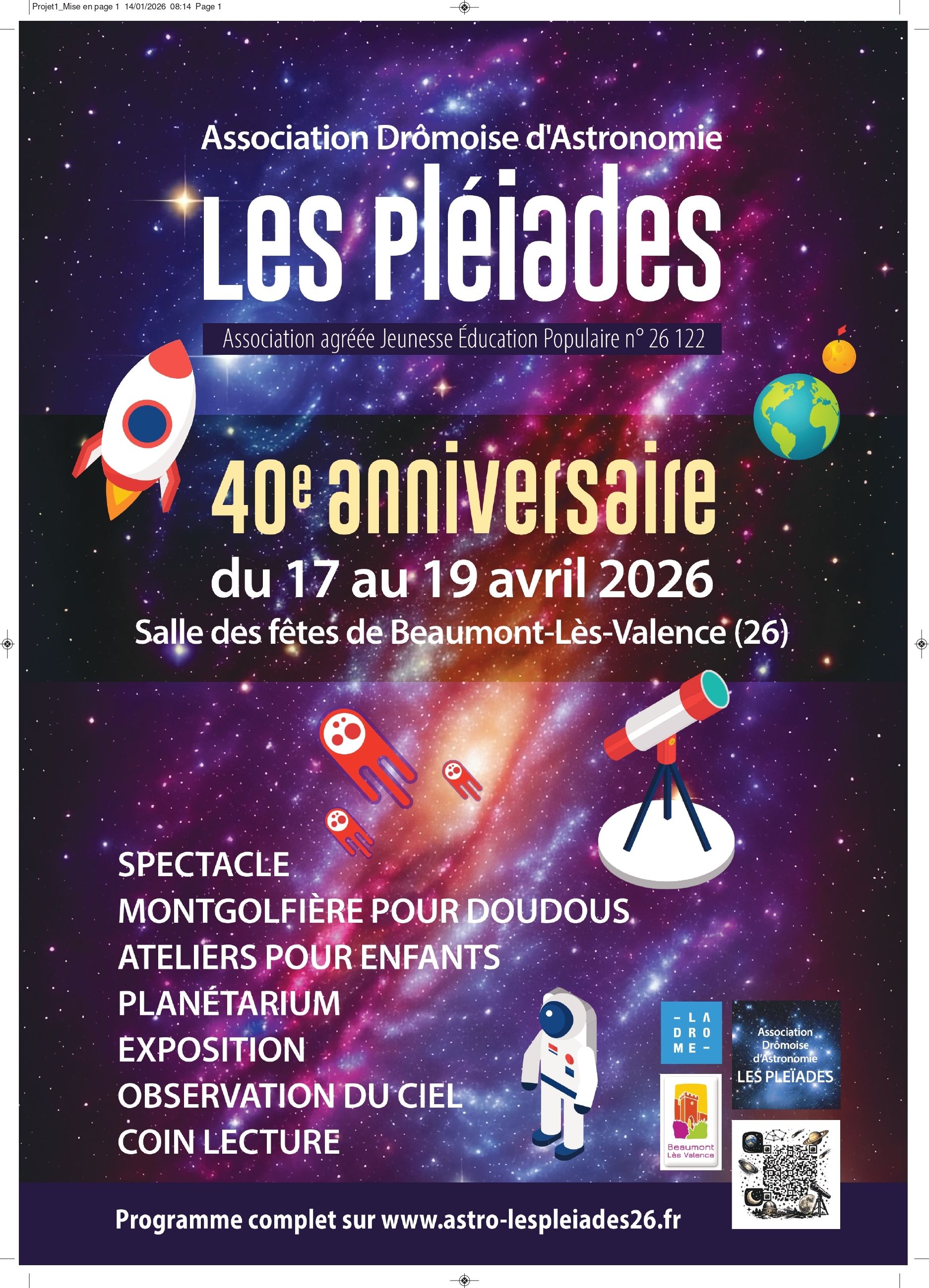 Informations complémentaires et inscriptions: https://astro-lespleiades26.fr/index.php/40eme-anniversaire/
