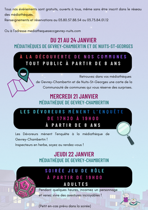👉 Mercredi 21 janvier, rendez-vous à la médiathèque de Gevrey-Chambertin entre 17h30 et 19h pour « Les dévoreurs mènent l’enquête » (à partir de 8 ans) 🕵️