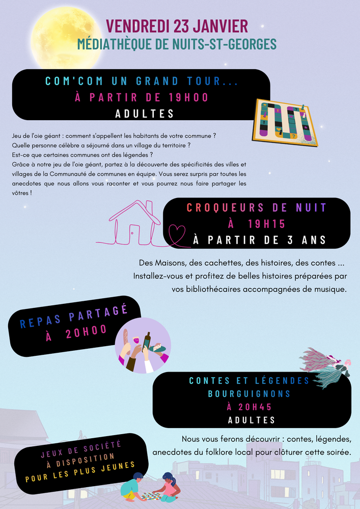 👉 Vendredi 23 janvier, à la médiathèque de Nuits-Saint-Georges, soirée riche en animations ! A partir de 19h, les adultes sont invités à jouer à un jeu de l’oie géant pour partir à la découverte des villes et villages de la Communauté de communes.