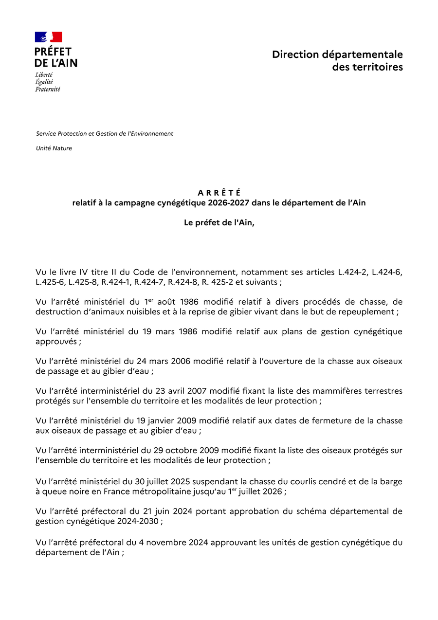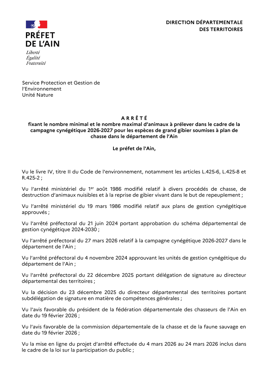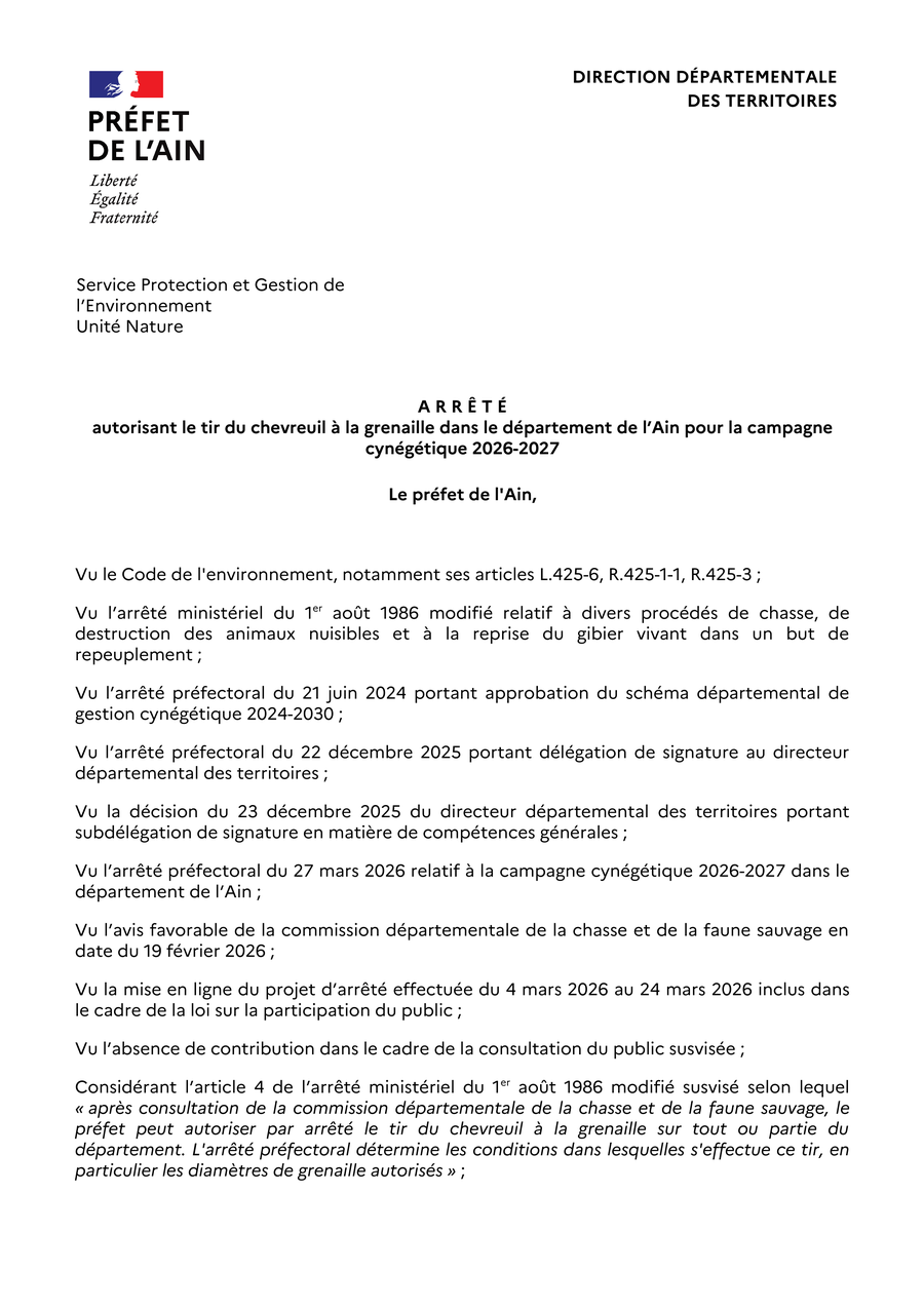 - du 2 avril 2026 autorisant le tir du chevreuil à la grenaille dans le département de l'Ain pour la campagne cynégétique 2026-2027