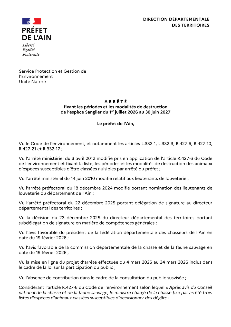 - du 2 avril 2026 fixant les périodes et les modalités de destruction de l’espèce Sanglier du 1er juillet 2026 au 30 juin 2027