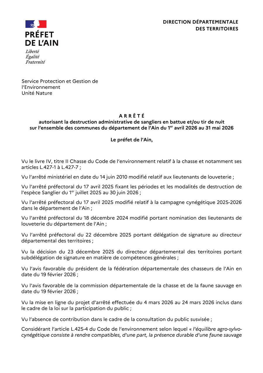 - du 2 avril 2026 autorisant la destruction administrative de sangliers en battue et/ou tir de nuit