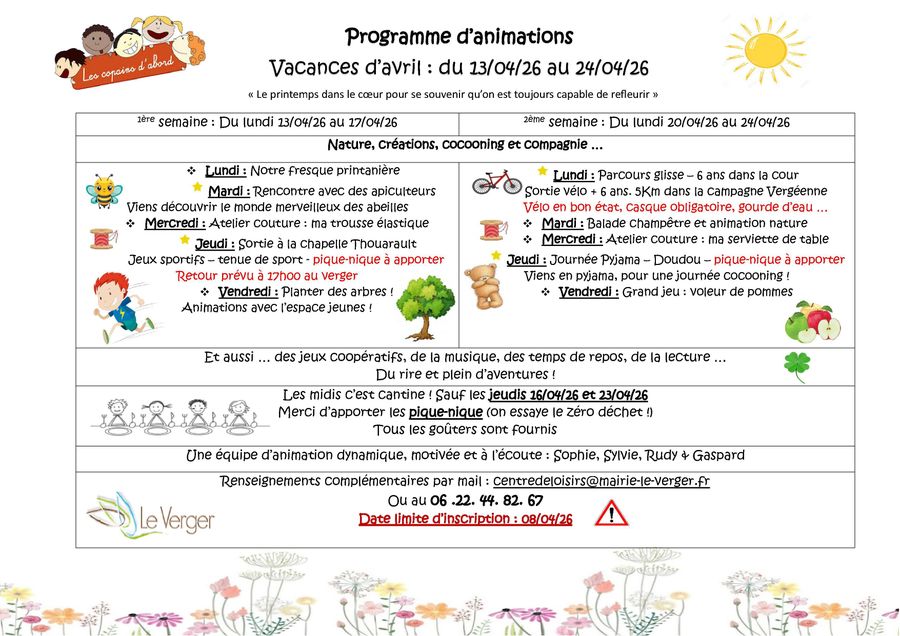 Du 13 au 24 avril 2026, préparez-vous pour deux semaines d'aventures sous le signe de la nature, de la création et du bien-être. Sophie, Sylvie, Rudy et Gaspard ont concocté un programme riche en découvertes pour vos enfants :