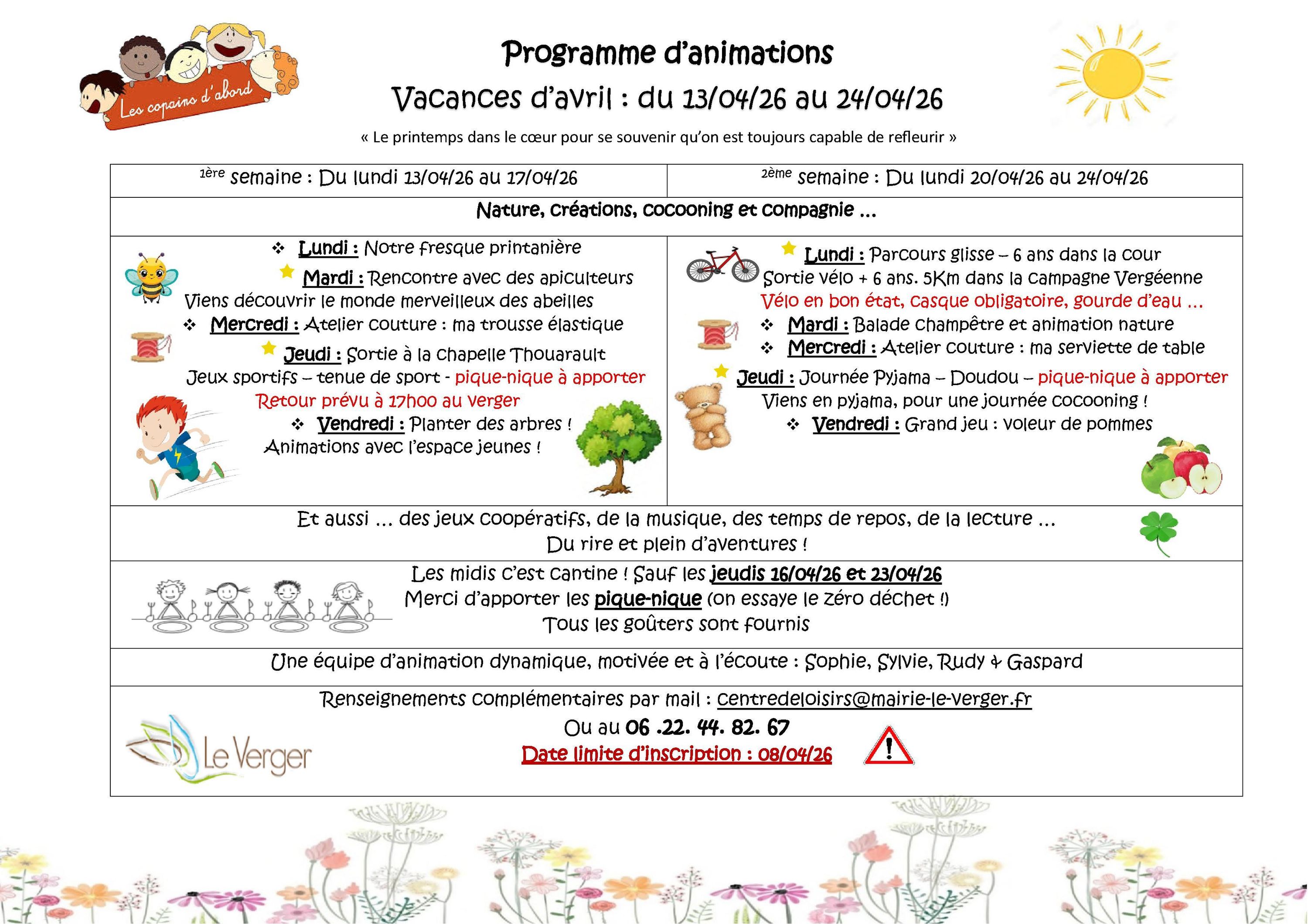 Pique-niques : À prévoir impérativement les jeudis 16 et 23 avril (objectif Zéro Déchet !). La cantine assure le repas les autres jours.