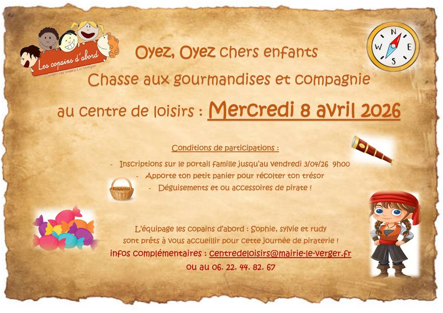 Le centre de loisirs « Les copains d’abord » lève l’ancre pour une aventure épique ! Le mercredi 8 avril 2026, préparez-vous pour la grande Chasse aux gourmandises et compagnie.
