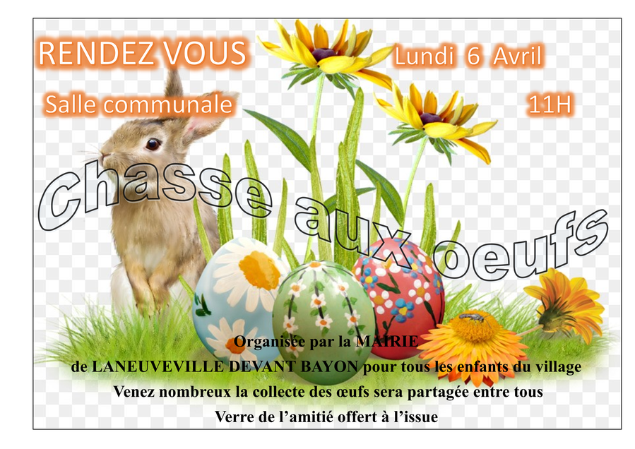 Rendez-vous salle communale le lundi 6 avril à 11 h00 pour la chasse aux oeufs organisée par la mairie pour les enfants du village jusque 11 ans.