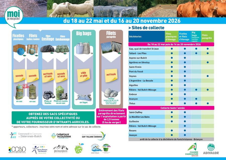 ADIVALOR et la CCCV vous informent que la prochaine campagne de collecte de déchets agricoles se tiendra du lundi 18 au vendredi 22 mai 2026.