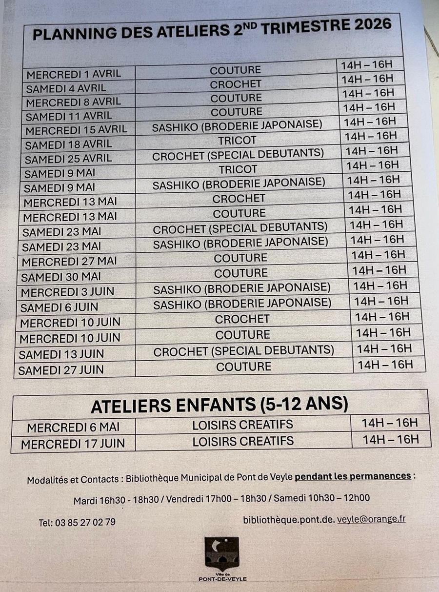Le planning des ateliers du second trimestre 2026 est arrivé.