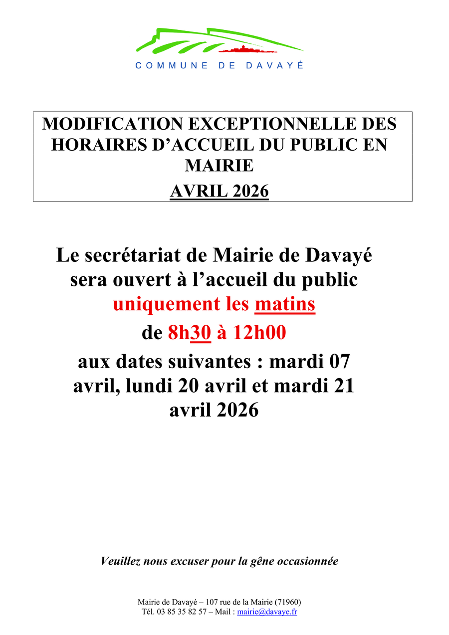 Le secrétariat de Mairie de Davayé sera ouvert à l’accueil du public uniquement les matins