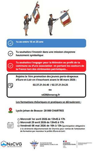 Avec le soutien de la Préfecture d'Eure-et-Loir, des formations de jeunes porte-drapeaux sont proposées aux jeunes volontaires âgés de 15 à 25 ans qui souhaitent s'engager en tant que futurs porte-drapeaux au sein de leur commune ou d'associations et ainsi devenir de véritables passeurs de mémoire.