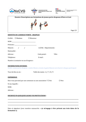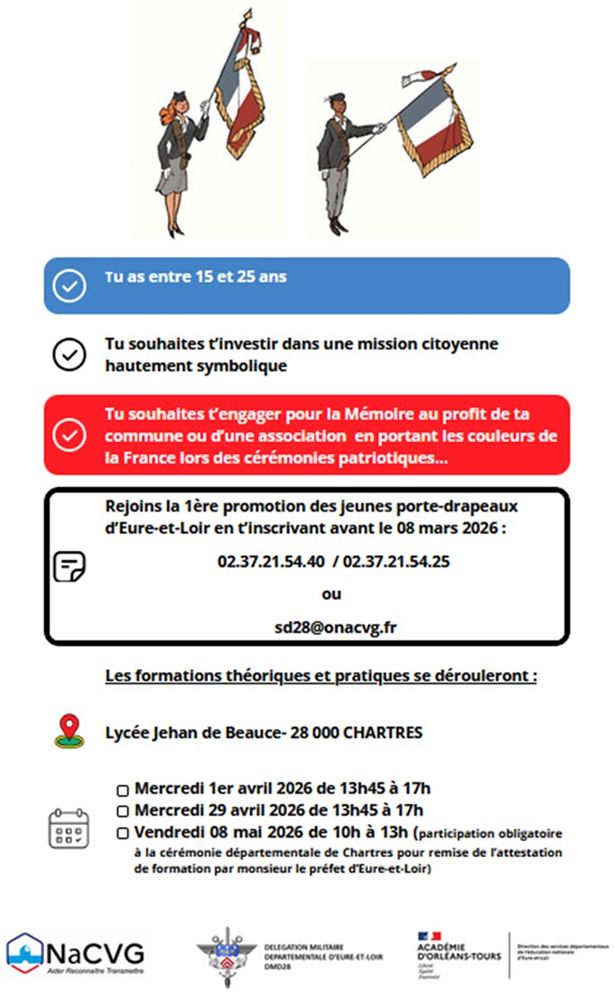 Faites vous parrainer en déposant votre dossier d'inscription en mairie (en pièce-jointe) et rejoignez la première promotion des jeunes porte-drapeaux d'Eure-et-Loir en vous inscrivant avant le 8 mars 2026 :
