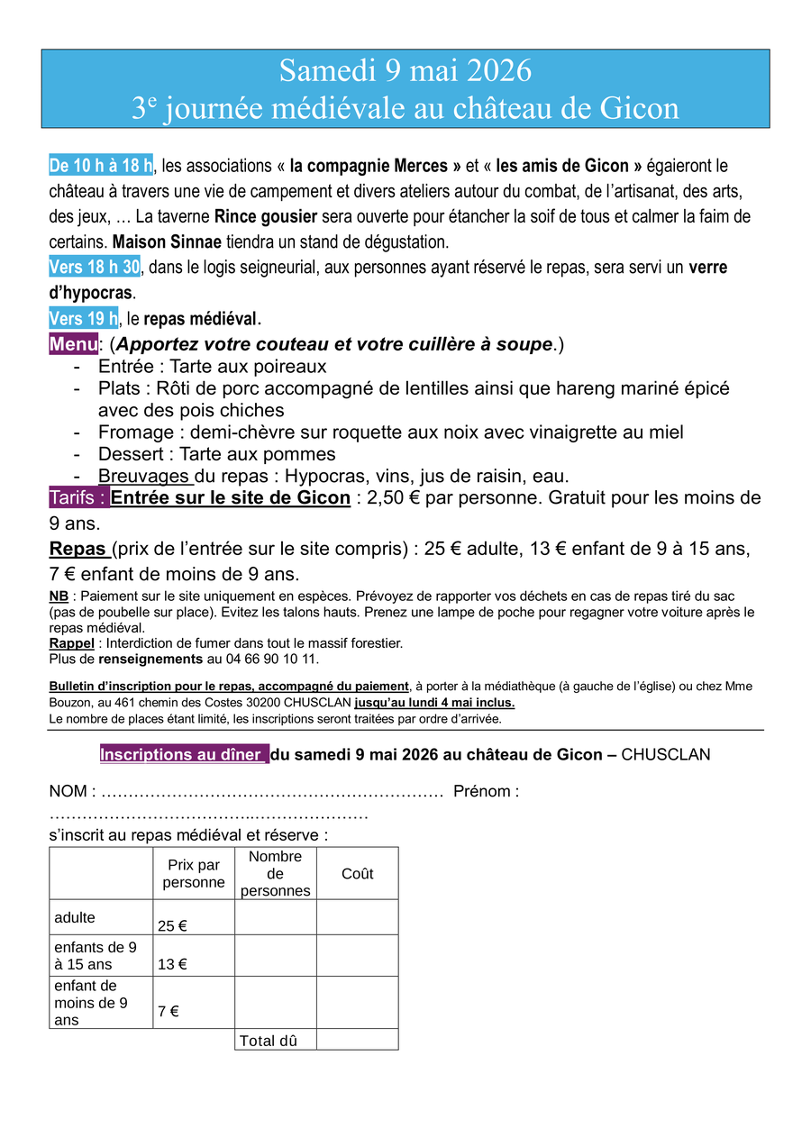 le programme de la journée avec les modalités d'inscriptions au repas médiéval