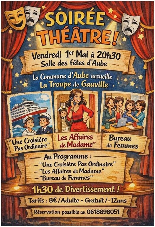 Si vous avez manqué les représentations données à Gauville, n'hésitez pas à venir passer un bon moment avec la troupe de théâtre de Gauville vendredi 1er mai à 20h30 à la salle des fêtes d'Aube.