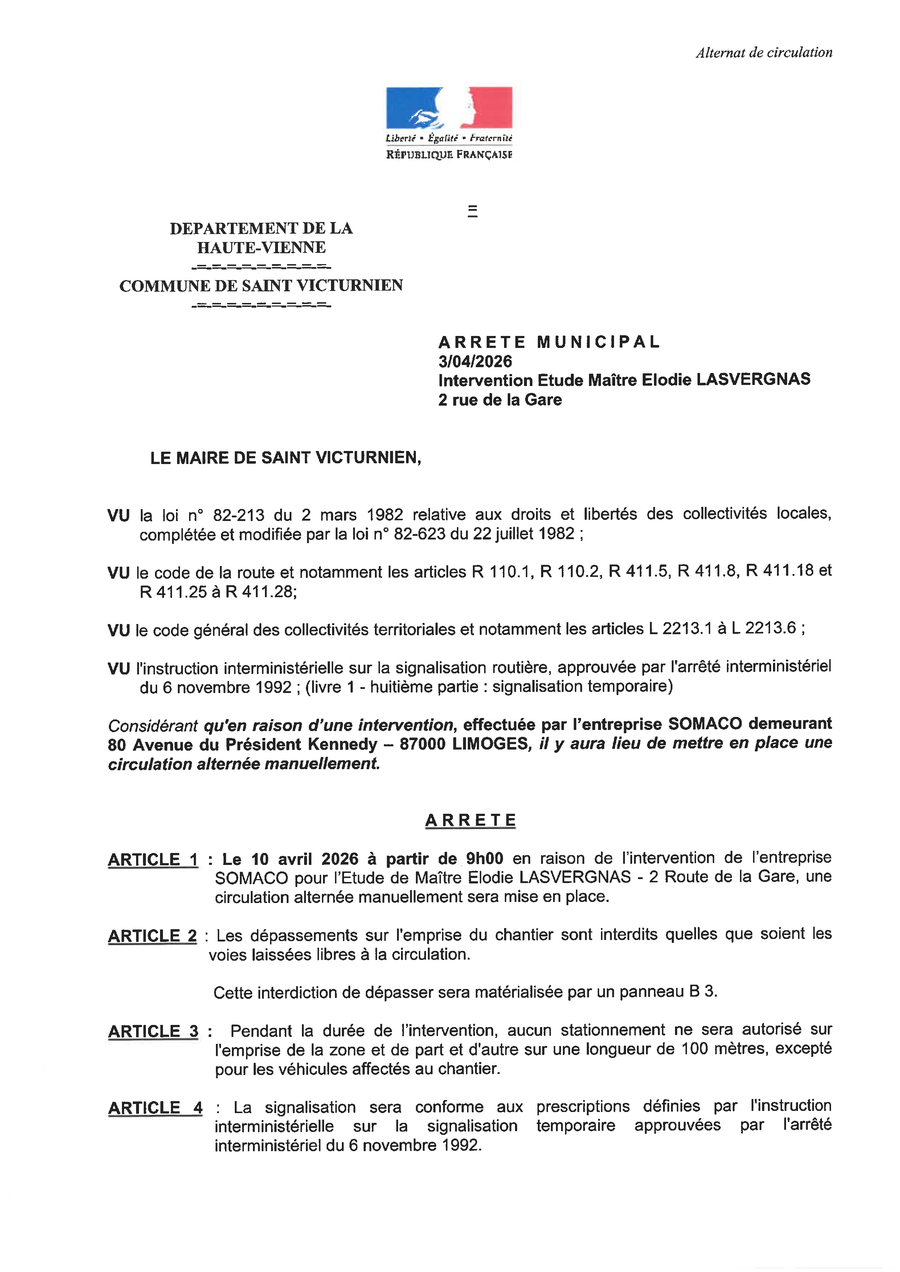 Le 10 avril 2026 à partir de 9h, une circulation alternée sera mise en place route de la Gare en raison d'une intervention de l'entreprise SOMACO.