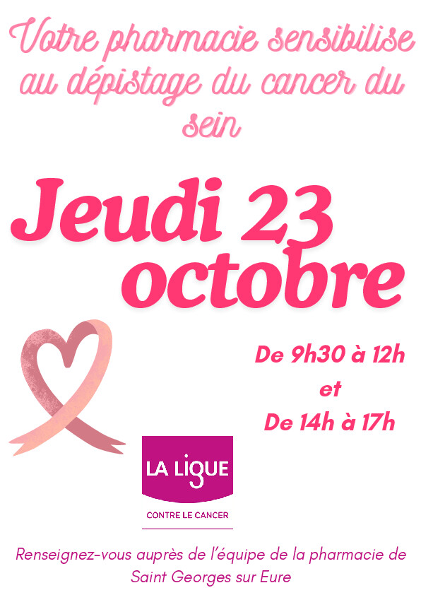 🔷 La Pharmacie de Saint Georges sur Eure se mobilise en faveur de la sensibilisation au dépistage du cancer du sein.