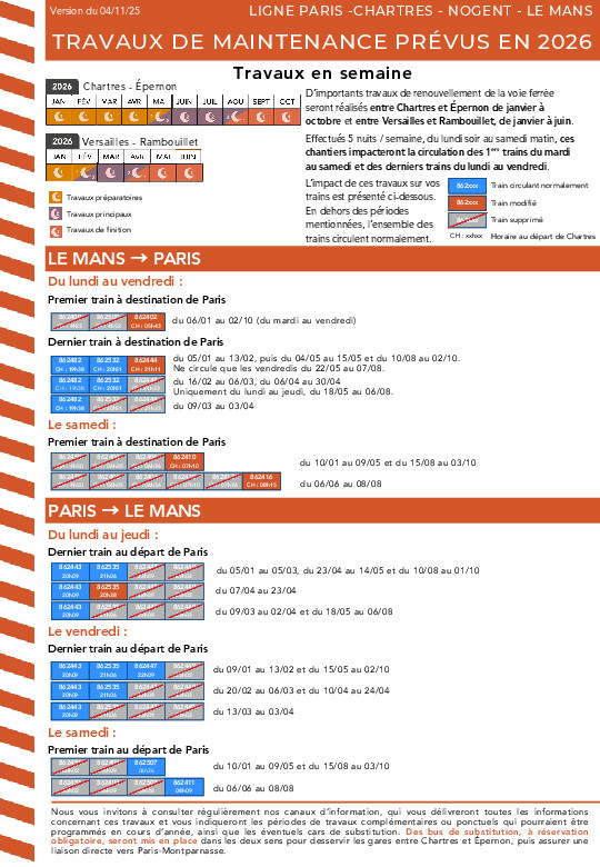 â Plusieurs week-ends de travaux entraĂźneront des interruptions partielles de circulation, notamment pour le renouvellement dâaiguillages en gare de Paris-Montparnasse et de Rambouillet.