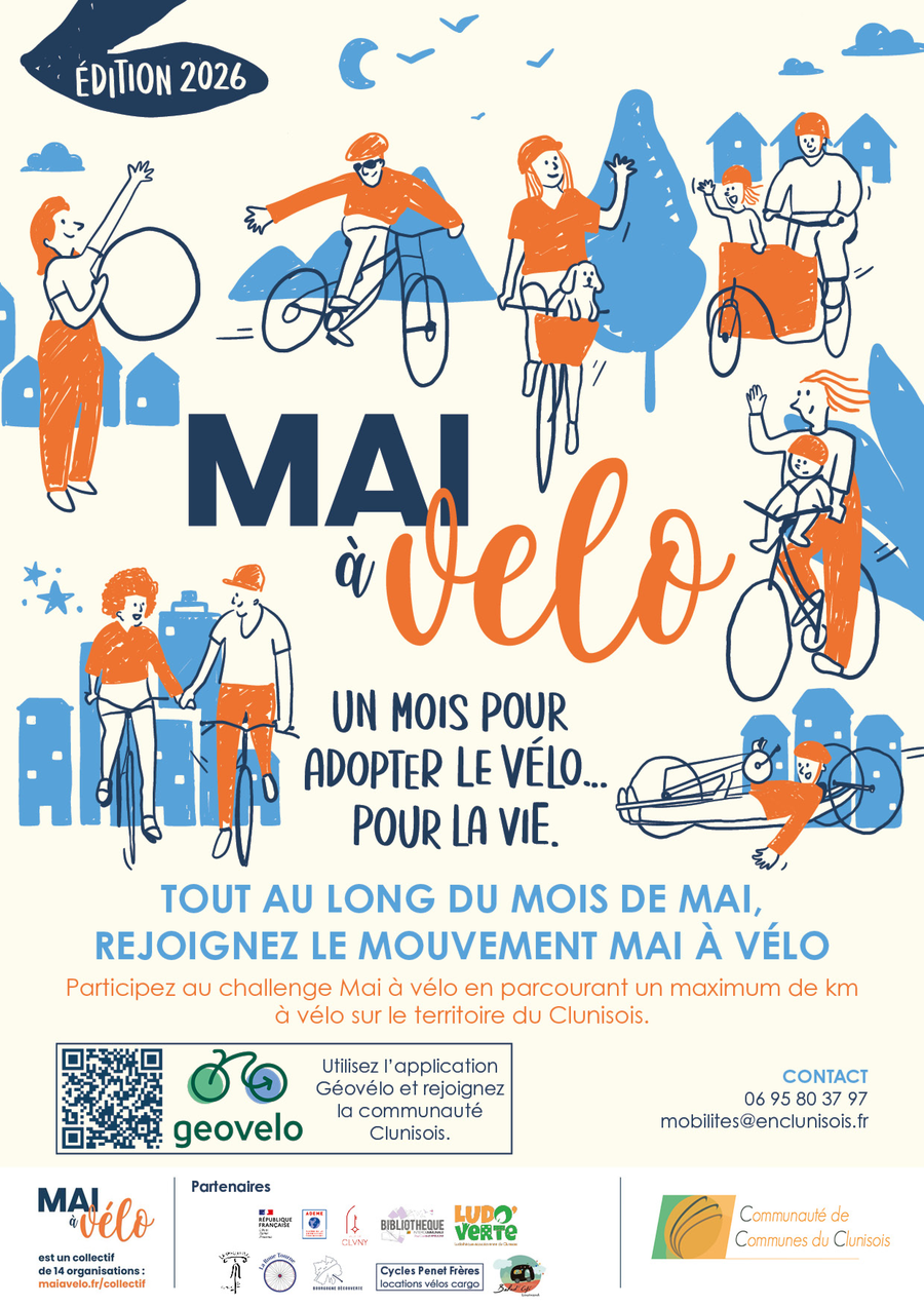 Tout au long du mois de mai, la Communauté de communes du Clunisois s’inscrit dans l’opération nationale « Mai à vélo ». L’objectif : promouvoir les mobilités actives et valoriser les usages du vélo sur le territoire. Habitants, usagers et curieux sont invités à participer à un challenge collectif et à de nombreux rendez-vous autour de la pratique du vélo.