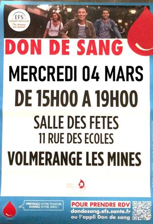 La prochaine collecte de sang aura lieu le mercredi 4 mars 2026 de 15h00 à 19h00 à la salle des Fêtes, rue des Ecoles à Volmerange-les-Mines.