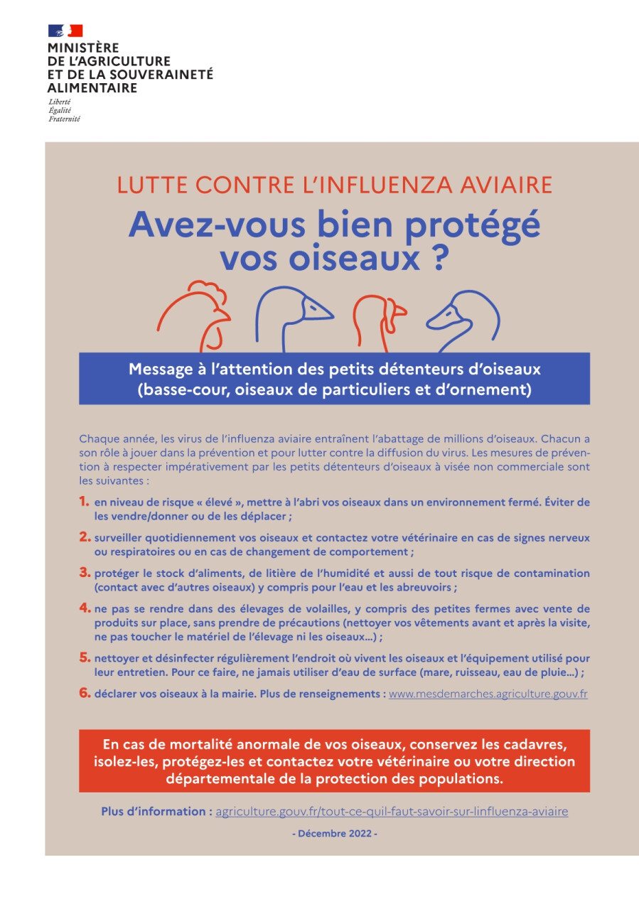 Le recensement par les mairies des détenteurs de volailles à finalité non commerciale (basses-cours dès la première volaille ou le premier oiseau) est obligatoire. Vous voudrez bien télécharger et remplir le formulaire dématérialisé CERFA 15472*02 disponible sur le site : https://www.mesdemarches.agriculture.gouv.fr/demarches/particulier/effectuer-une-declaration-55/article/declarer-la-detention-de-volailles et le remettre en mairie. Ci-après une communication du Ministère de l’Agriculture.