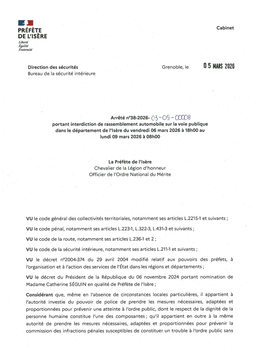 Arrêté n° 38-2026-03-05-00008 portant interdiction de rassemblement automobile sur la voie publique dans le département de l'Isère du vendredi 6 mars à 18h au lundi 9 mars à 8h.